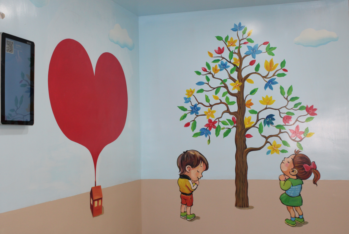 记者发现,该家医院每一个楼层都有一个主题画面。例如二楼被设计成一列长长的健康列车,诊室的门正好充当了列车的“门”,小患者一进一出,就像在月台上上车或下车,无形中化解了病人和家属的焦虑感。在休息区,背景墙上画的是一幅动物园主题,斑马、长颈鹿、河马济济一堂,伸长脖子四处张望,它们似乎正在吃墙角处的绿植。